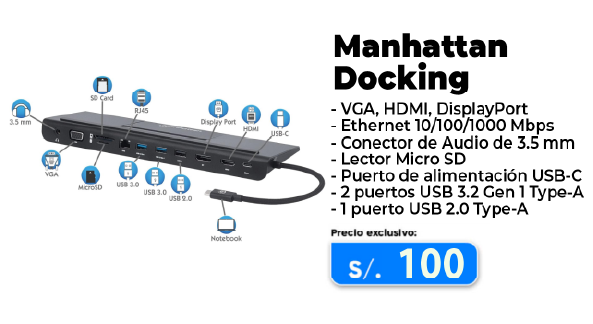 VGA/HDMI/DisplayPort; Ethernet 10/100/1000; Audio 3.5mm; Micro SD; Power USB-C; 2x USB 3.2 Gen1; 1x USB 2.0 • Garantía 6 meses
